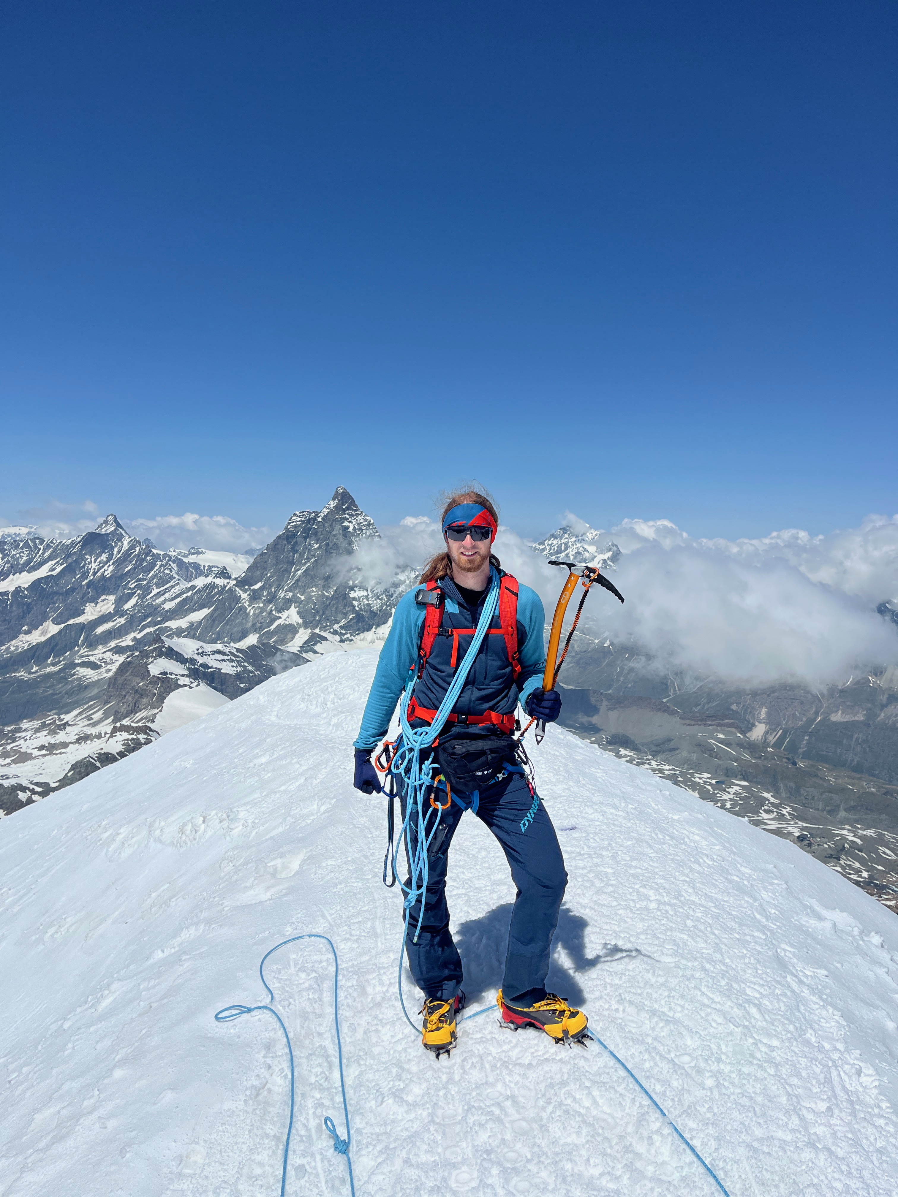 Grzbiet szczytowy Breithorn to już prawdziwa górska przygoda. Ostatnie metry to najstromszy fragment, wymagający użycia czekana Climbing Technology nie tylko do równowagi, ale też do dodatkowego punktu oparcia. Zejście później okazało się strome, ale przy stabilnych warunkach śnieżnych całkowicie bezpieczne.